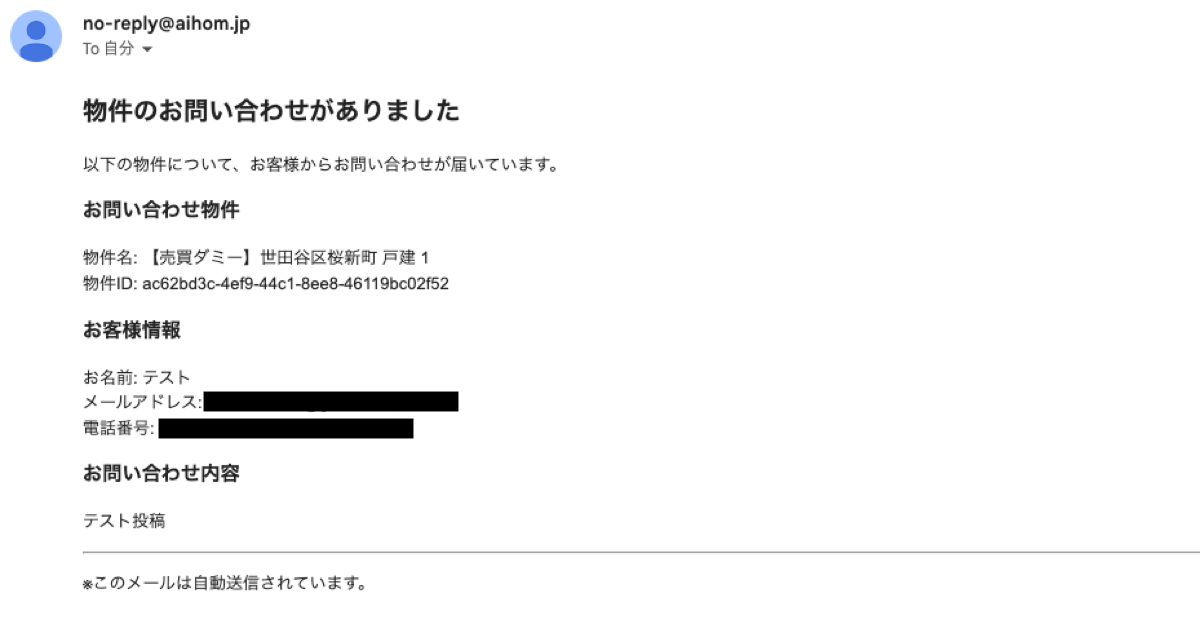 公開中の物件にお問い合わせが入ると、組織に参加しているメンバーへ通知メールが送られます。お客様には お問い合わせ内容確認 の自動返信メールが届きます。