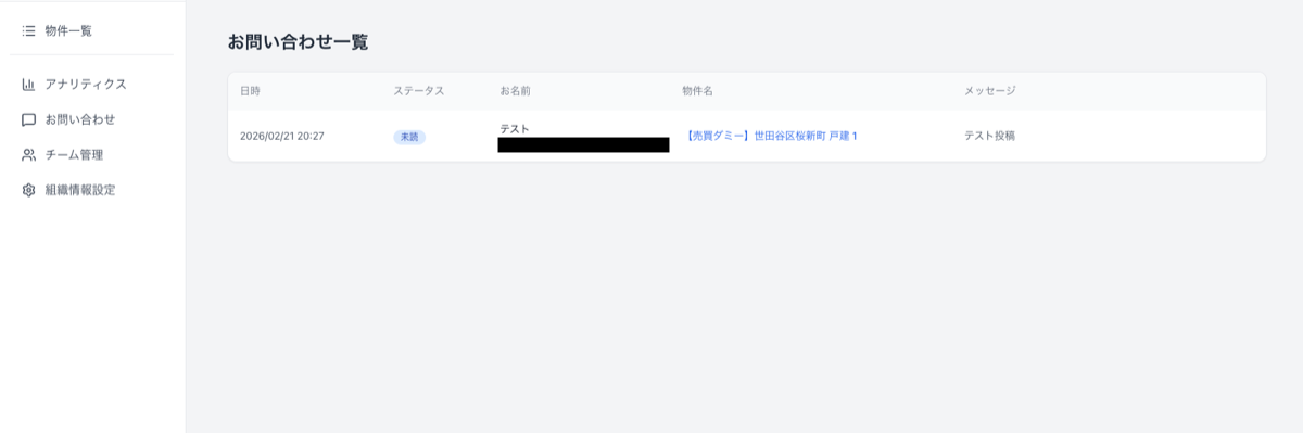 左メニューの お問い合わせ を開くと、受信した反響を一覧で確認できます。画面上部のプルダウンから すべての物件 または特定の物件に絞り込めます。
