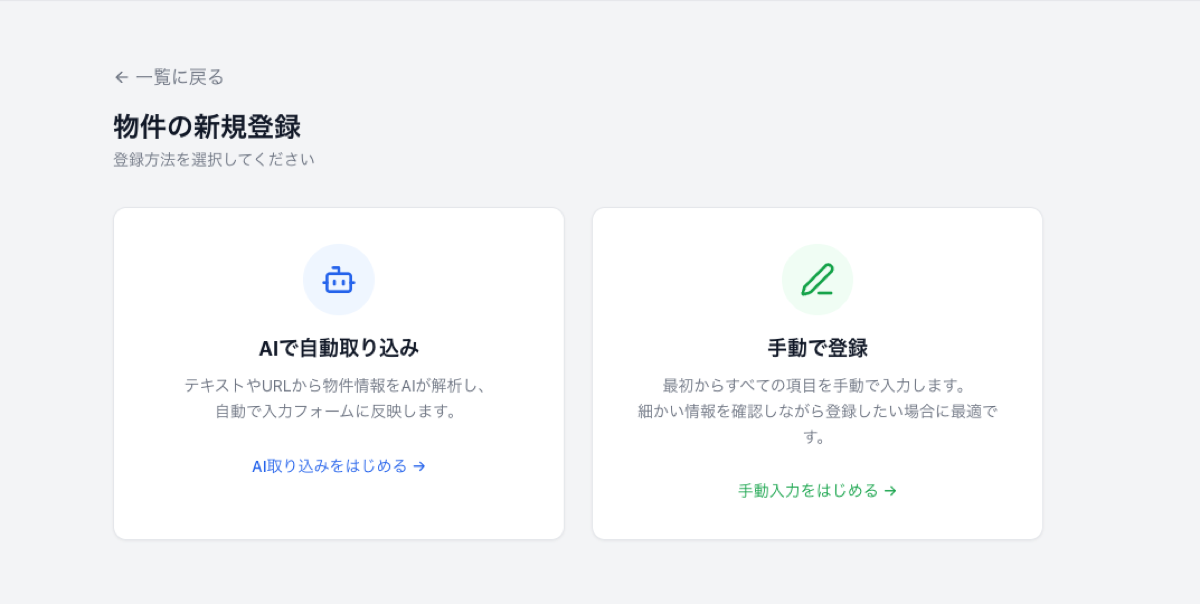 登録した物件は 物件一覧 に表示されます。物件名を押すと再編集できるので、AI取り込み後の補正や画像追加、公開準備はここから続けて行ってください。
