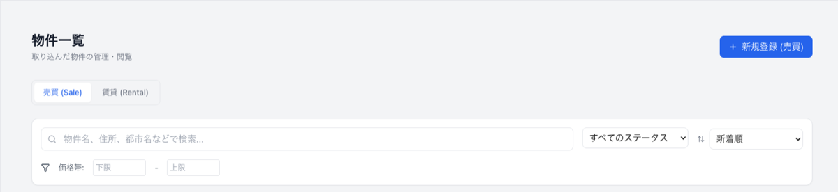 物件一覧 を開き、上部の 売買 (Sale) または 賃貸 (Rental) を選びます。その後、右上の 新規登録 (売買) または 新規登録 (賃貸) を押してください。