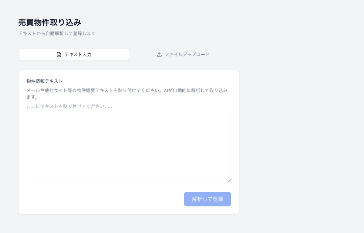 AIで自動取り込み を押すと、売買物件取り込み または 賃貸物件取り込み 画面が開きます。ここでは テキスト入力 と ファイルアップロード の 2 つを使えます。