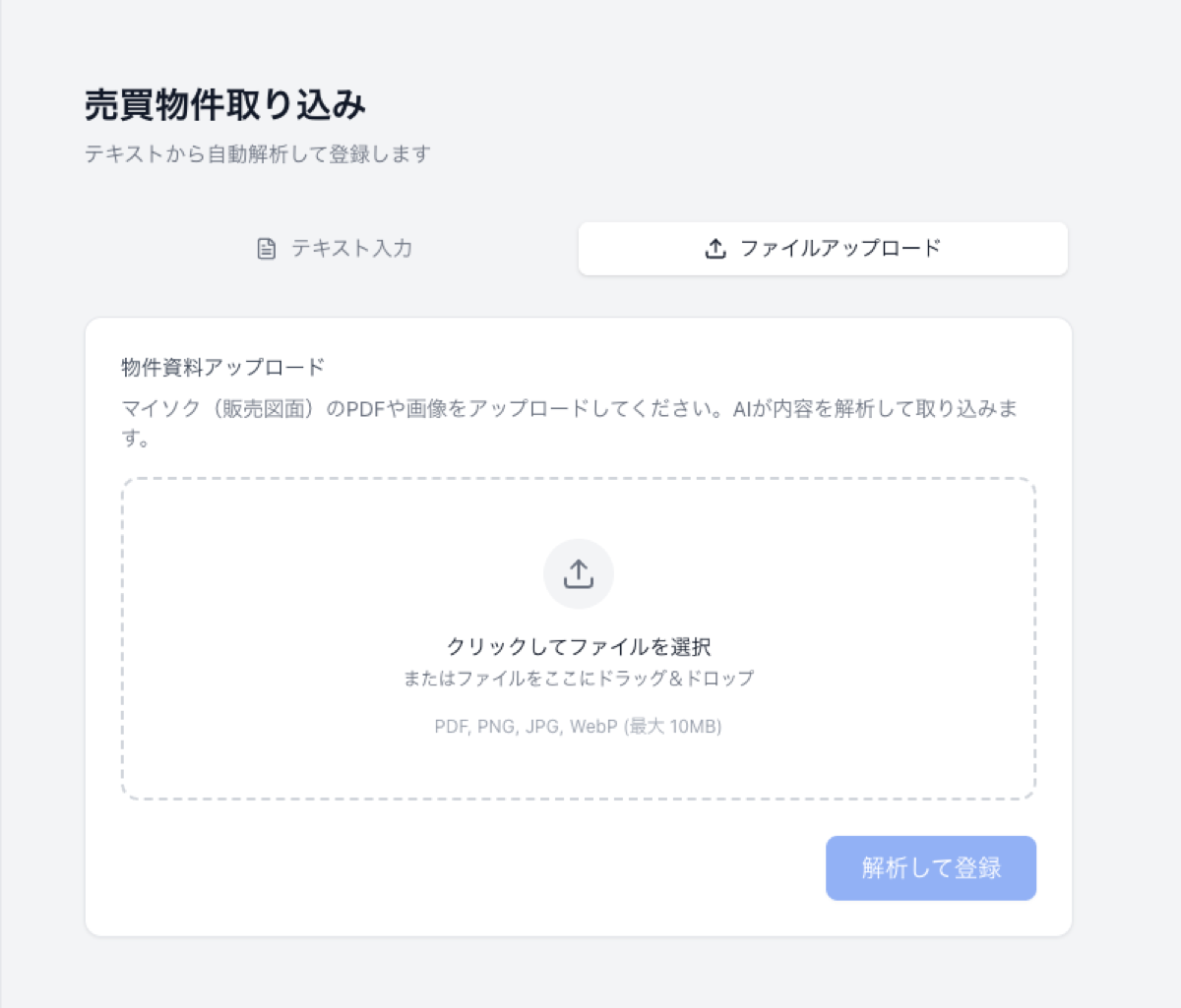 対応ファイルは PDF / JPG / PNG / WebP です。こちらも解析後は 物件一覧 に下書きとして追加されます。