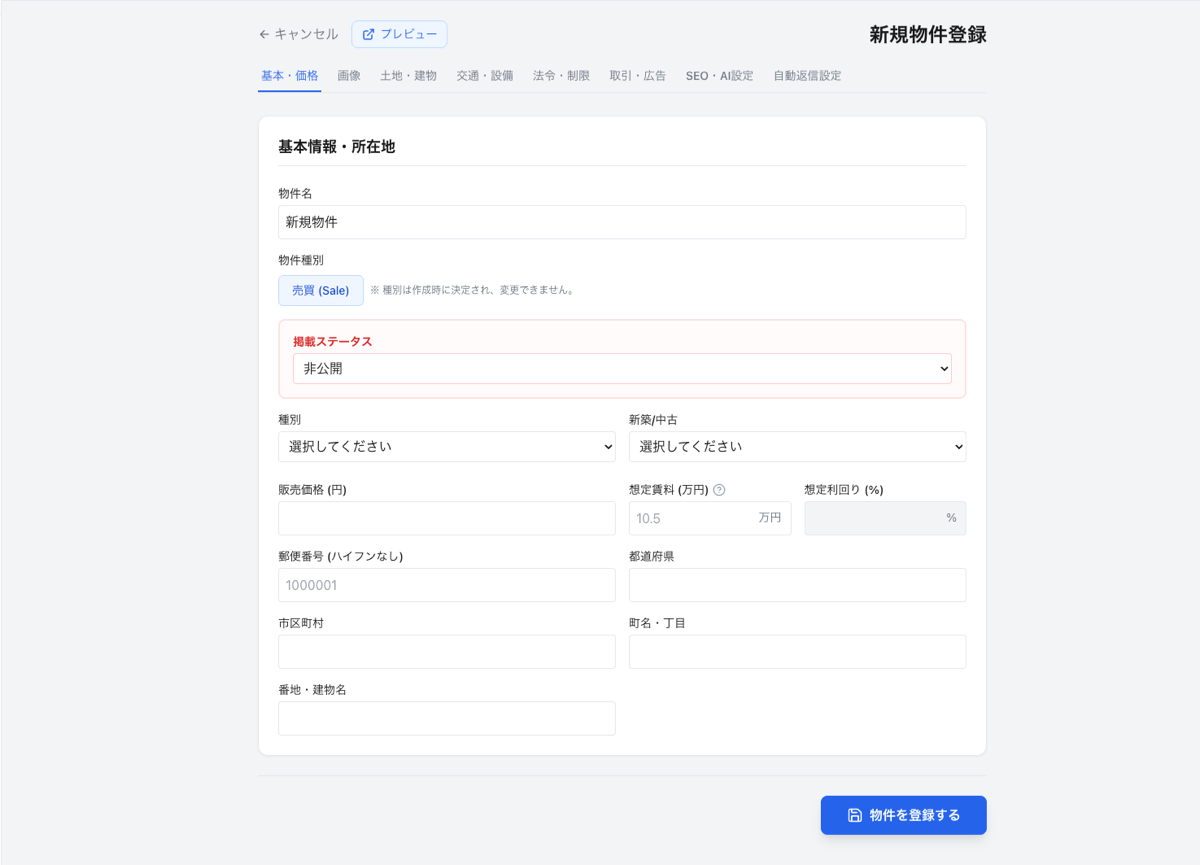 手動で登録 を押すと、新規物件 という下書きが作成され、そのまま編集画面が開きます。画面上部のタブを使って、必要な情報を順に入力してください。