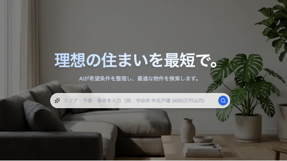 トップページの大きな検索欄では、自然な文章で条件を入力できます。たとえば 守谷市 中古戸建 3000万円以内 のように入力すると、AI が内容を整理して検索結果ページへ移動します。
